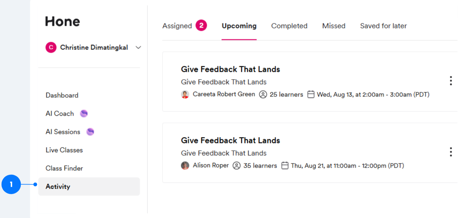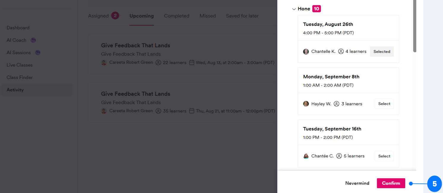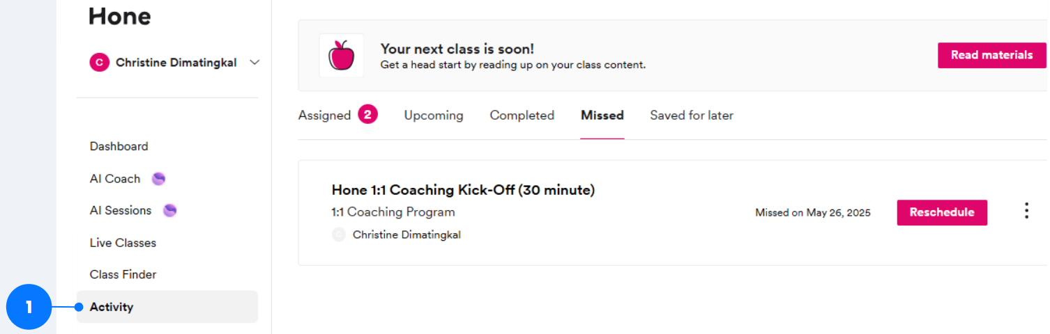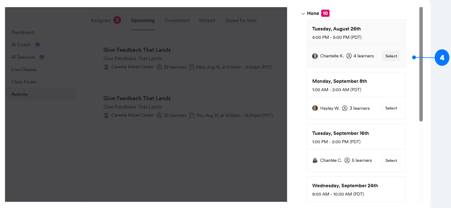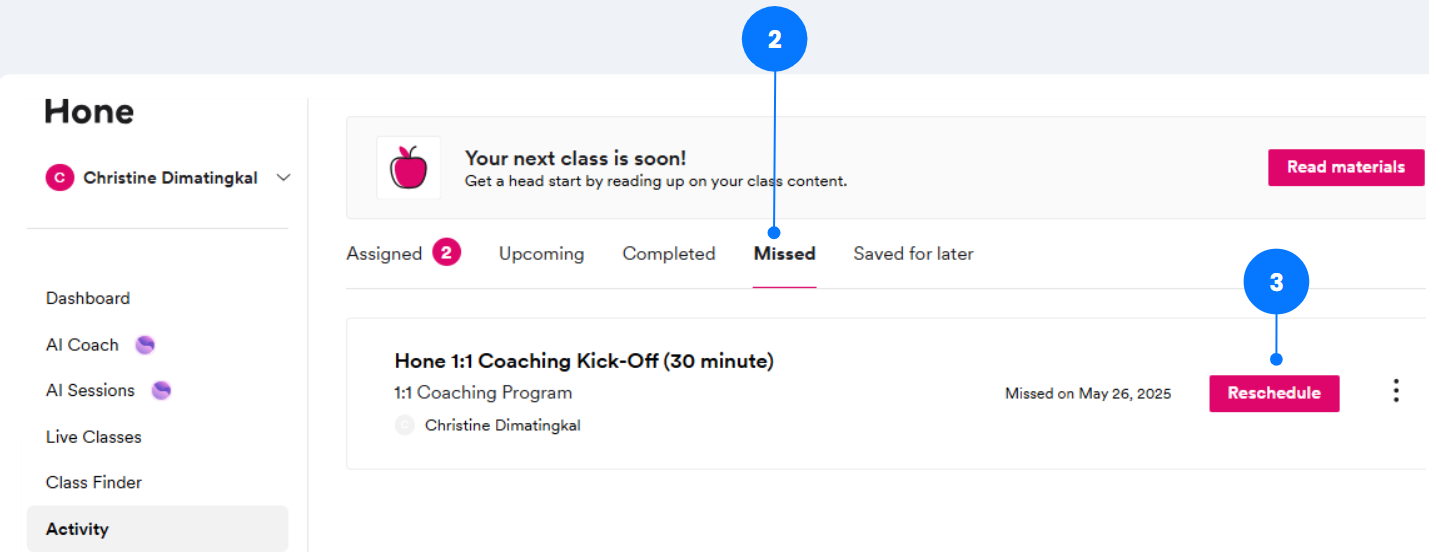 - If there are no options available, your class will remain under the ‘Missed’ section of your Learner Dashboard until a future class becomes available to your organization.