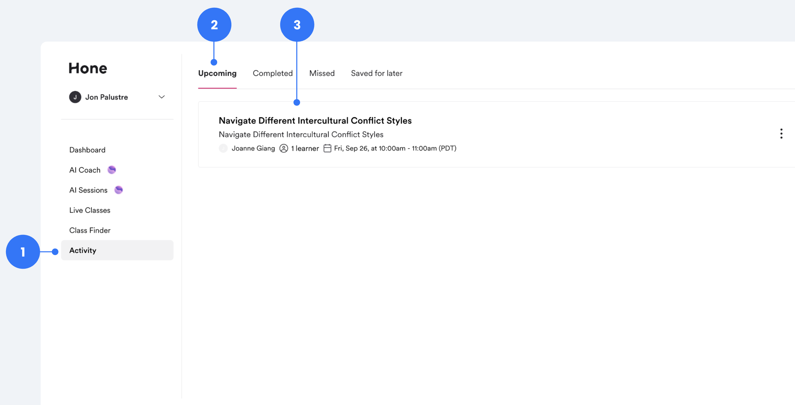 2. Find the class under the 'Upcoming, Completed, or Missed' page.