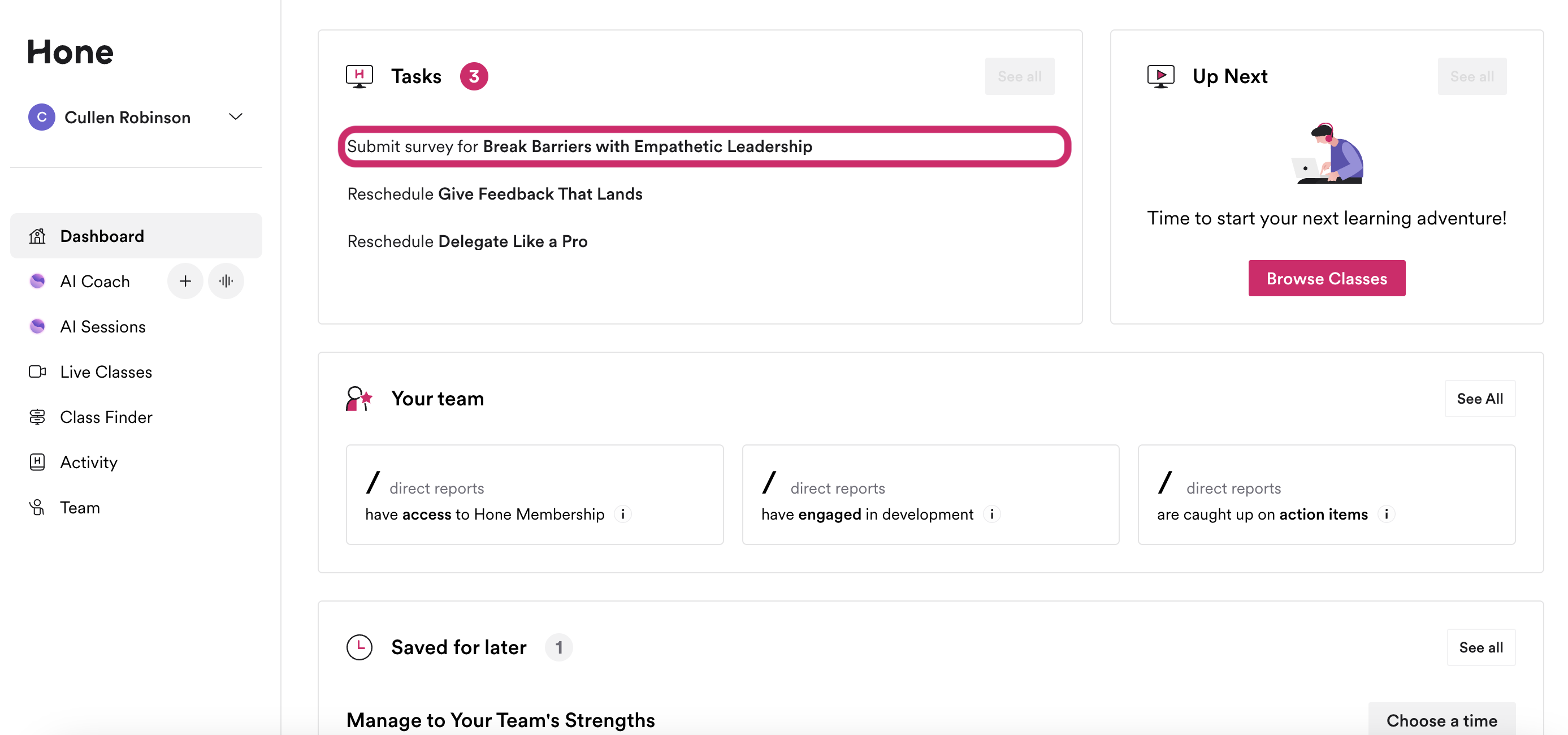 You will also be able to access the commitment and feedback survey link as an outstanding task at the top of your Learner Dashboard.