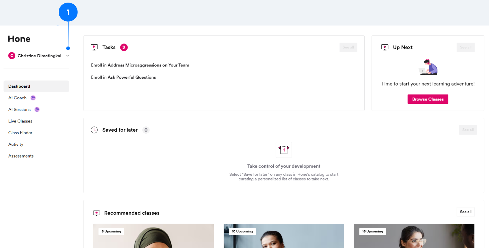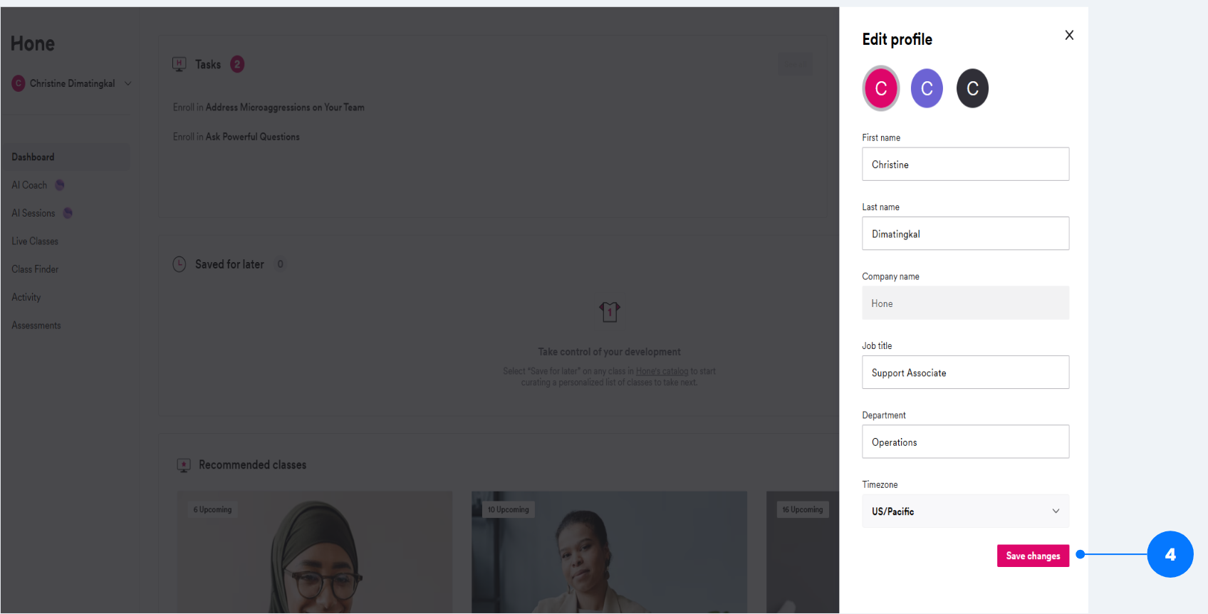 - When you sign in to the Hone platform for the first time, you're prompted to set your timezone preference. This ensures classes are displayed in your preferred timezone.