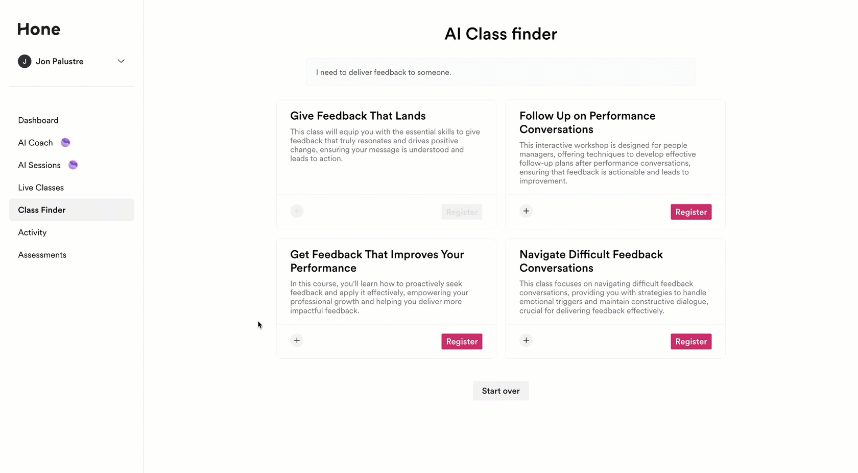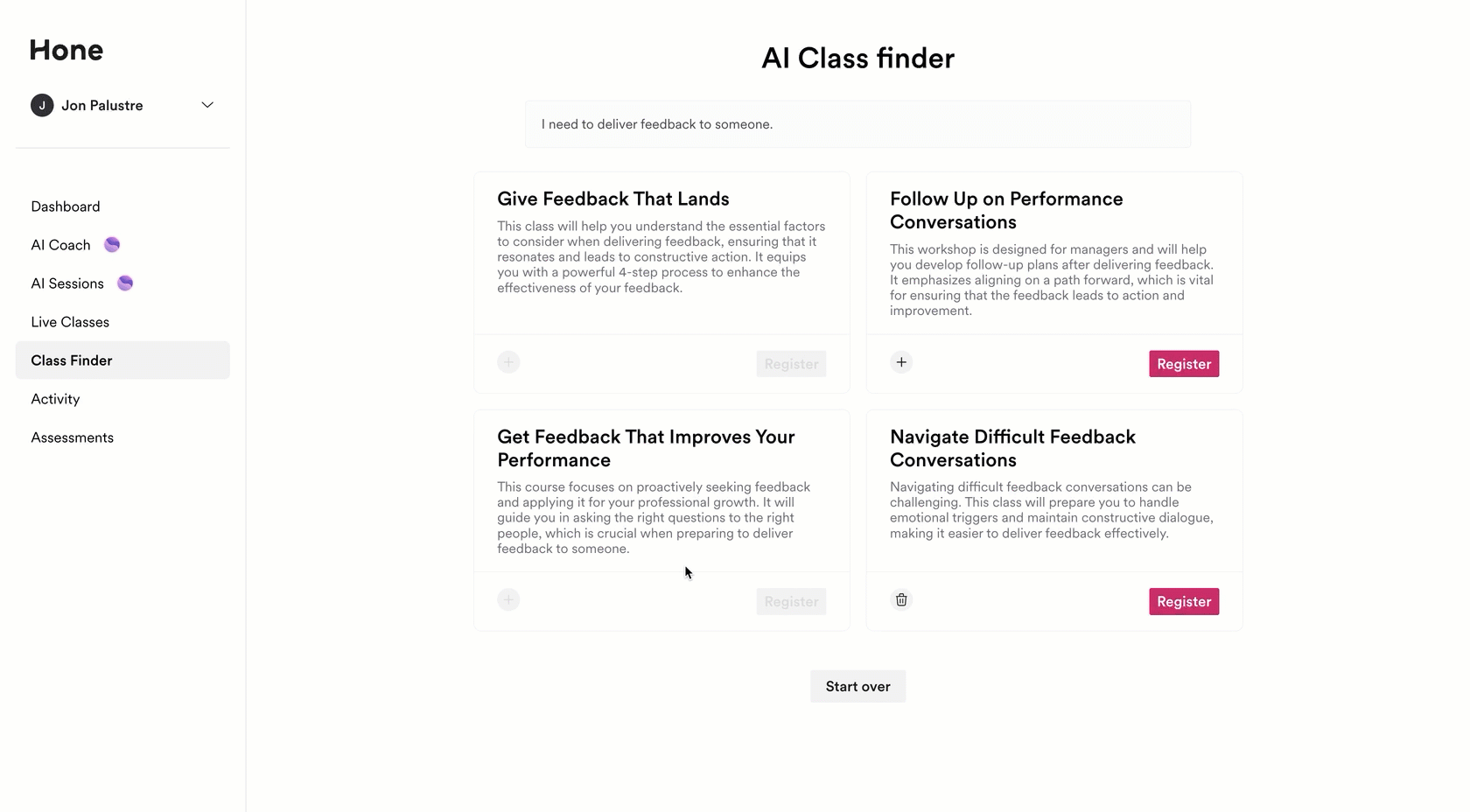 - Learners can input their own prompts or select one of the pre-built prompts to generate suggested classes.